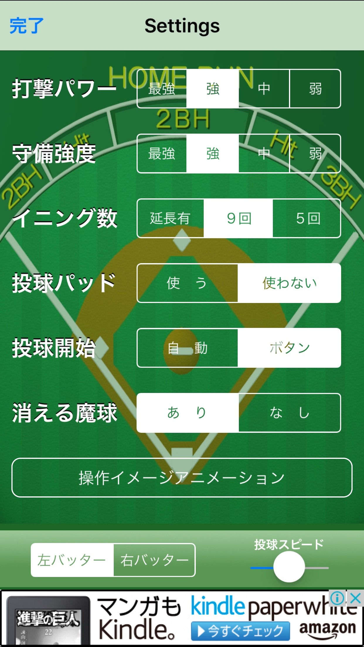 ・投球開始 … 自動とボタンがあり、ボタンをタップすると自分のタイミングで打撃ができます。