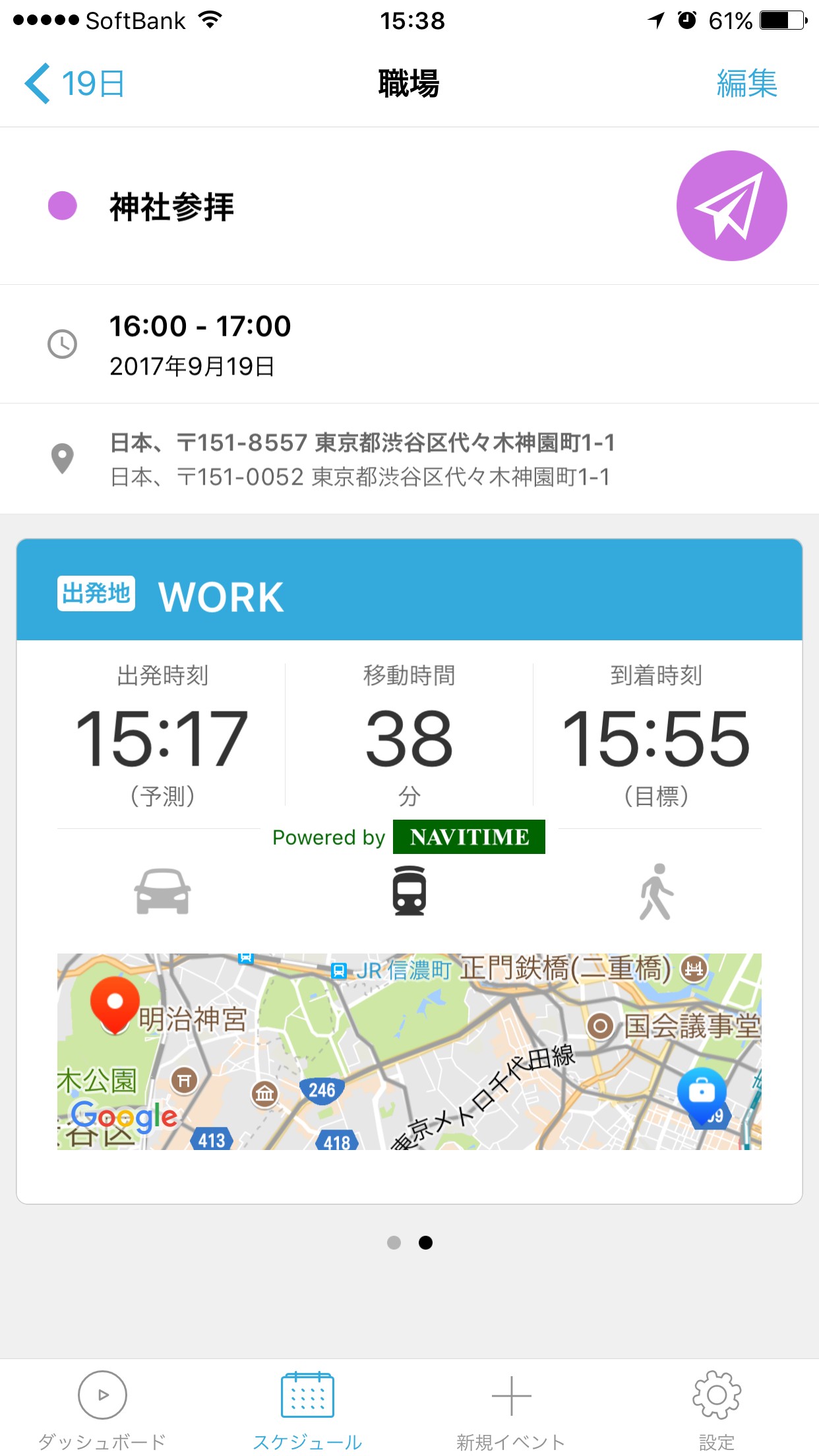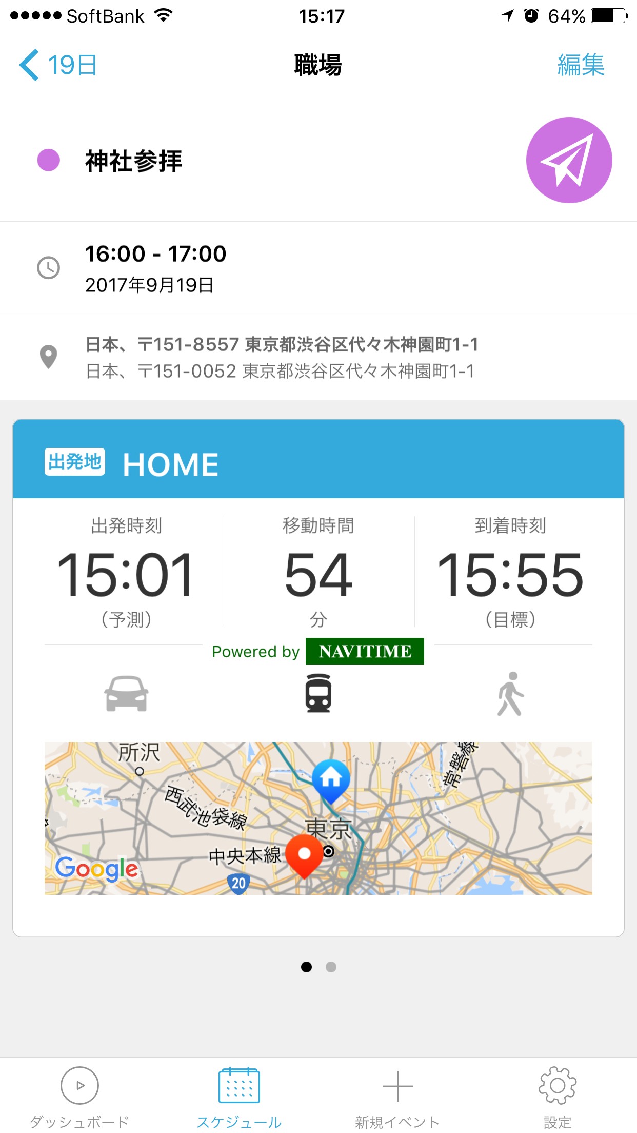 アプリ画面下の「新規イベント」をタップすることで、スケジュール登録とルート計算が一度に行えます。