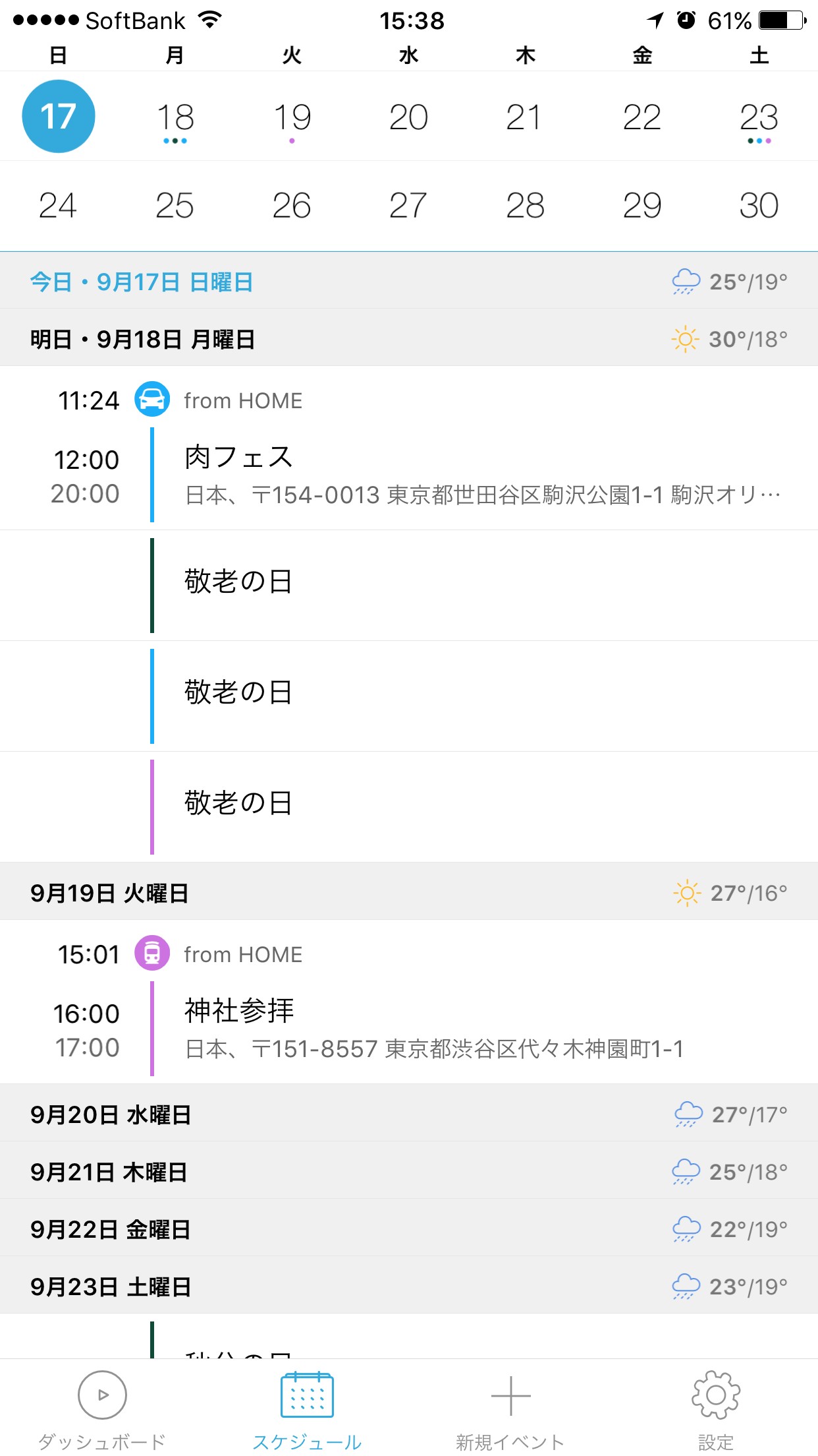 イベントに住所と時間を入れておけば、出発時間が近づいたイベントを通知してくれる機能があります。
