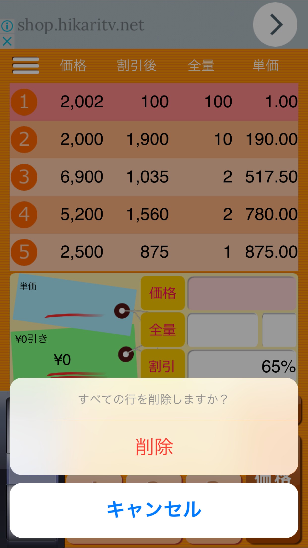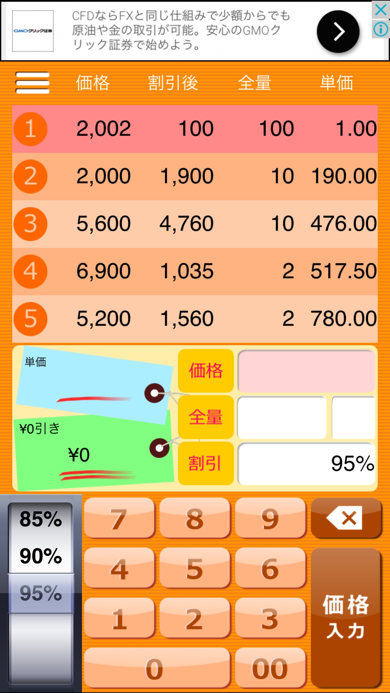 計算後、左側に単価(単品当たりの価格)と割引額+割引後の金額が表示されます。