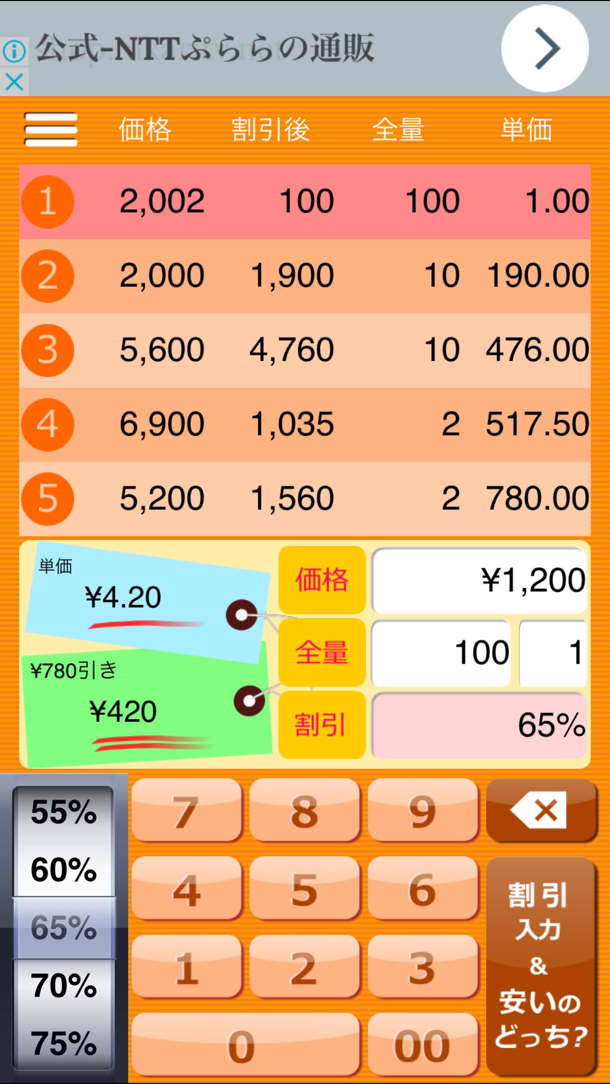 - 「安いのどっち?電卓」-割引率と個数から最小単位の最安値がわかる!