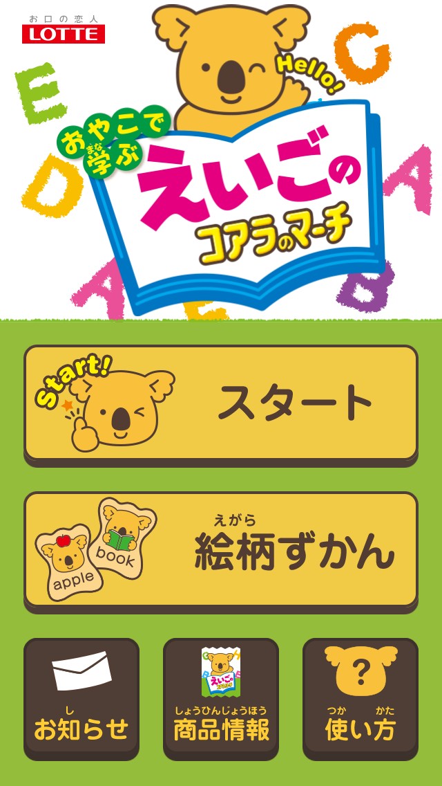 「えいごのコアラのマーチ」アプリは、株式会社ロッテが発売している”えいごのコアラのマーチ”のビスケットにスマートフォンをかざすと、コアラのマーチくんが画面に表示されて、スキャンしたビスケットに印字されている英単語の発音と日本語訳を知ることができます。初期画面が表示されると、楽しいメロディーが流れてコアラのマーチくんのアニメのような感じで始まります。