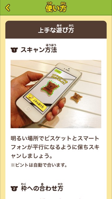 次に”ビスケットをかざしてみよう”を開くと、使い方の説明になっています。スタートをタップしたら、ビスケットを枠線に合わせるようにかざす画像を見て確認ができます。更に詳しく”上手な遊び方”の説明も合わせて見ておきましょう。まず、スキャン方法ですが、明るい場所でビスケットとスマートフォンが平行になるようにして画面に映してみましょう。この時、ピントは自動で合うようになっています。