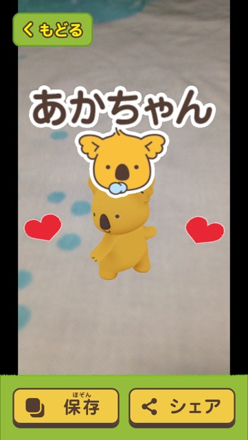 なお、マーチくんは画面の向きを変えることで、真上からの画像になったりとマーチくんを立体的に配置することもできますよ!撮影した写真は、保存ボタンをタップして保存したり、シェアボタンからTwitterやFacebook、メールでお友達に送信することもできて楽しく共有できるようになっています。