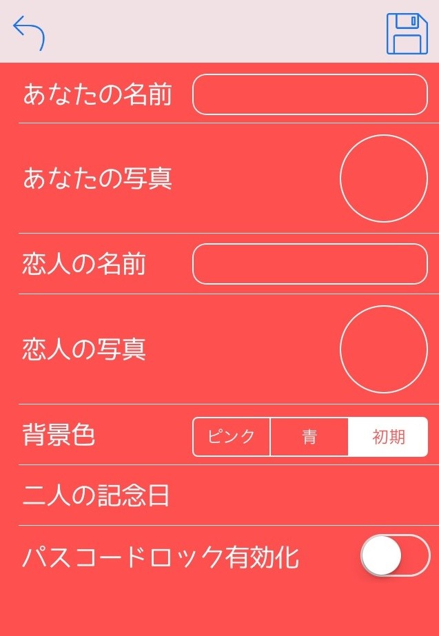プロフィール設定の方法はかんたんです。手順は、アプリを開いて右上にある設定マークを押すと設定画面に移動します。あなたの名前、恋人の名前、二人が付き合った記念日など入力します。任意であなたの写真、恋人の写真も登録すると良いですね。入力し終わったら右上にある保存マークを押せば完了です。付き合った日から何日経ったのか確認する方法は、アプリのホーム画面から左上にあるハートマークを押すと、何日経ったのかが表示されます。また、2人の思い出とたくさんの記念日を画像と文章で記録することができます。方法は、アプリのホーム画面から「Add New Memorial」を押すと入力画面に移動するので、タイトルとコメントに思い出の内容を入力して、画像や記念日を設定することができます。告白をした、された日。はじめて手をつないだ日、キスをした日など。2人だけの思い出を記録することができます。
