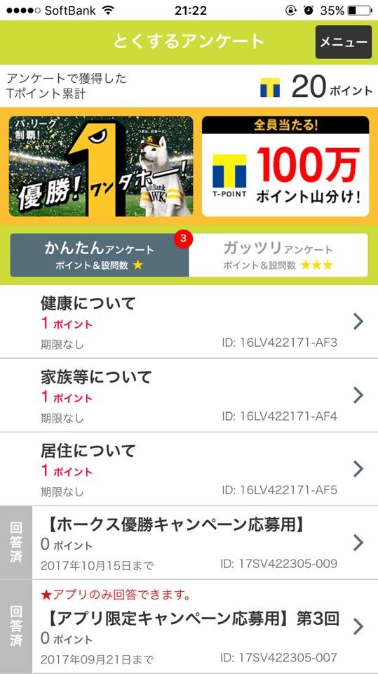 ・タイトル、獲得ポイント数が分かりやすく表示されているので、アンケートを選んで回答できる。。