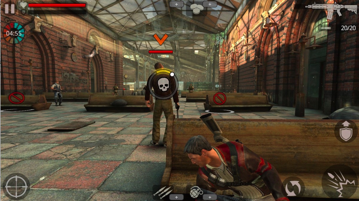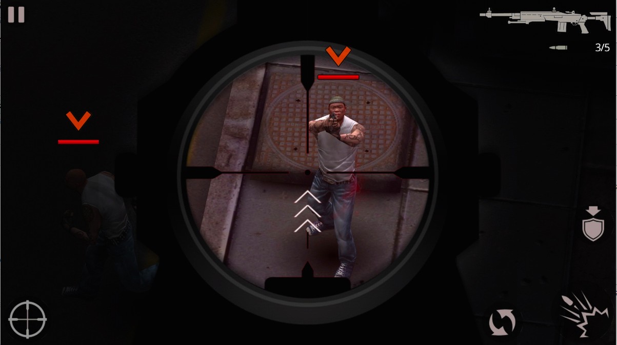 狙撃の操作はそれほどややこしいものではありません。狙えそうな敵の頭上に矢印が表示されるので、画面をスライドさせて大まかな標準を合わせた後、スコープを覗きこみましょう。右下のボタンをタップすることで弾が発射されます。敵に気付かれると一斉に攻撃してくるので、上手く身を隠したり場所を移動しながら戦っていってくださいね。