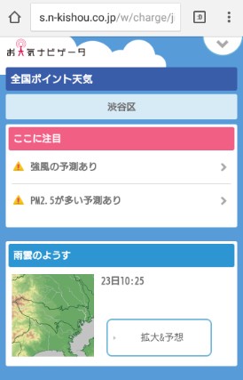 全国のピンポイント天気予報のほか、強風・PM2.5の予測、雨雲発生の様子がわかる降水マップが表示されます。