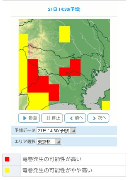 竜巻予測マップには、1時間先の竜巻発生の予測がグラフィックアニメーションで表示されます。