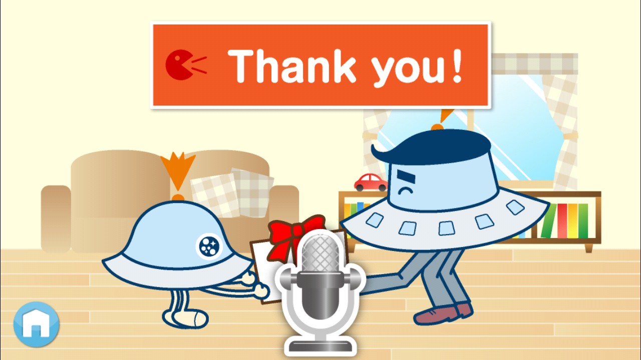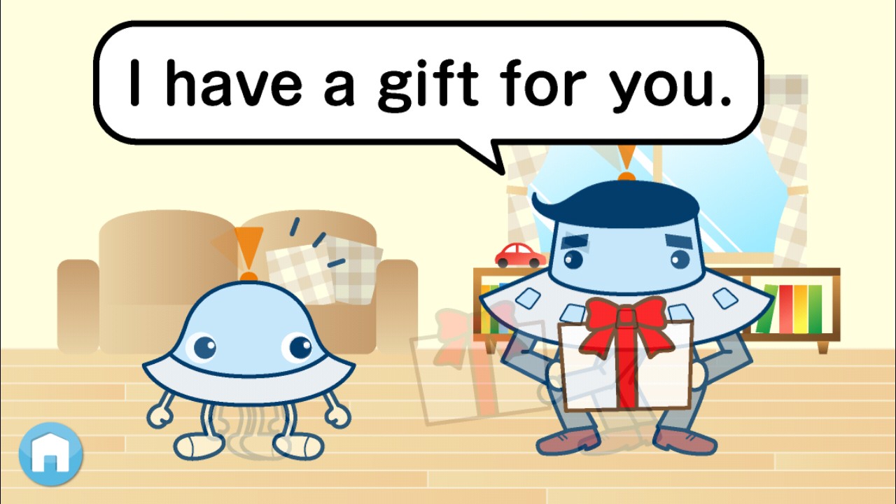たとえば、ある月の「えいごのあいさつ」は「「英語で感謝を伝える」というもの。ワオっちがプレゼントをもらう様子がアニメーションと英語で表現され、ワオっちが言うべき言葉をきちんと正しく言うことができれば合格です。目で見て、耳で聞き、会話の内容を理解しながら表現する仕組みになっているので、見る、聞く、話すという全てで英語に触れることができます。