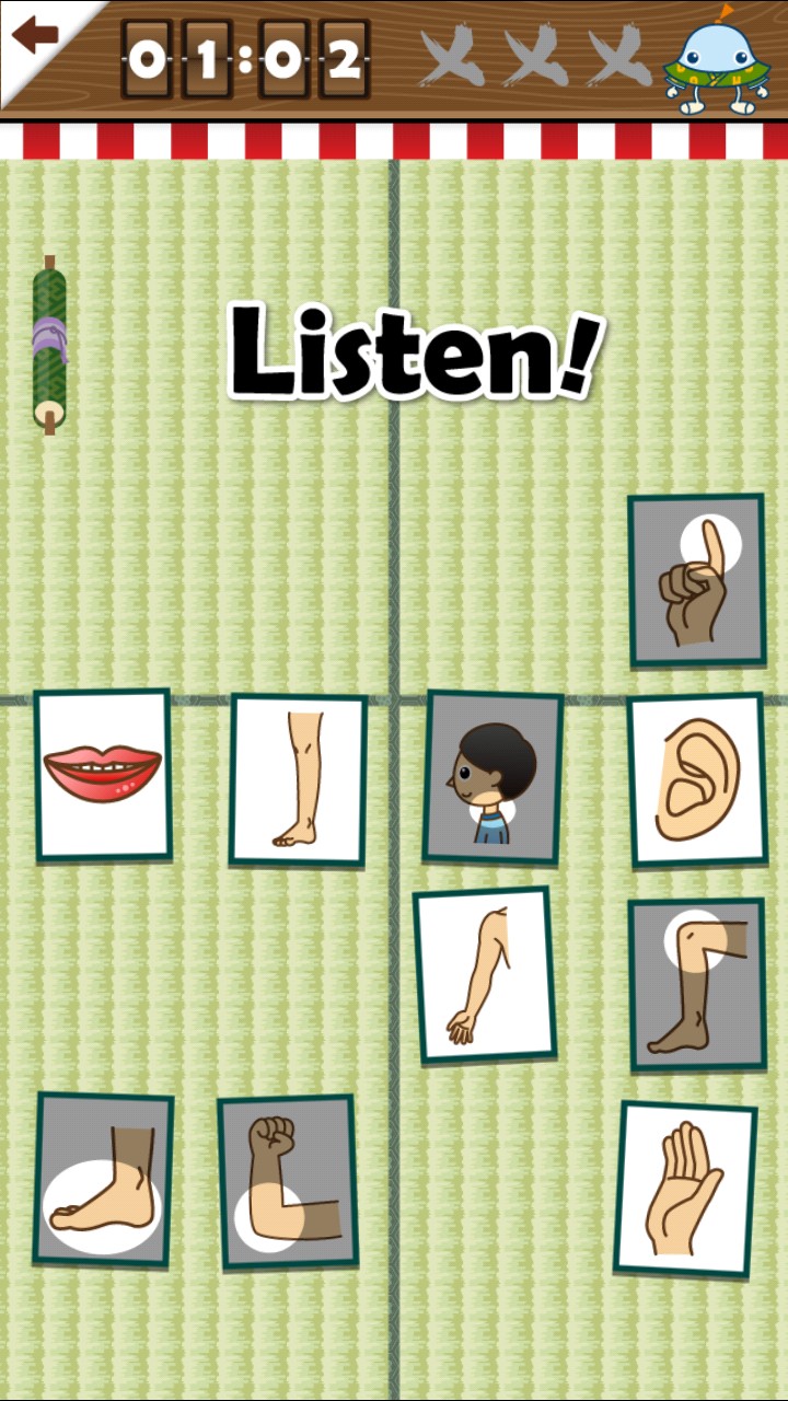 さらに、ゲームなら身体の英単語を使ったカルタ。最初は音声だけを聞いてカルタを選びますが、理解できなければ単語が出てきます。いずれも本格的で楽しいものばかりで、ヒアリング、スピーキング、単語など、英語を「使う」うえで必要なことを楽しく遊びながら身に付けることができるのです。
