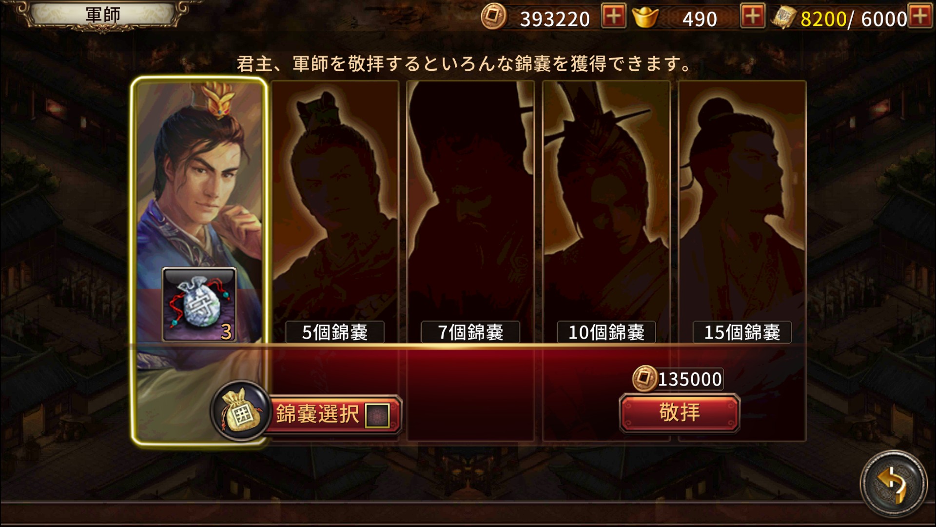 戦闘や報酬で手に入ったり「軍師」を敬拝(銭135000必要)をするとルーレットが回りそれぞれの軍師からランダムで錦嚢3個、5個、7個、10個、15個が手に入ります。