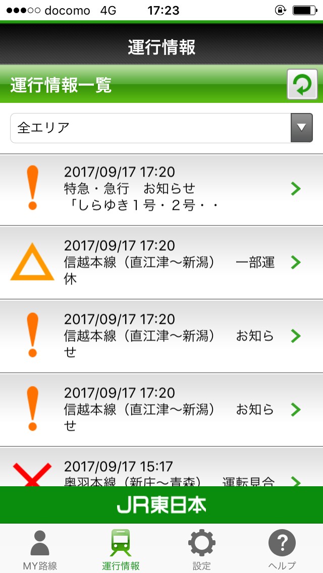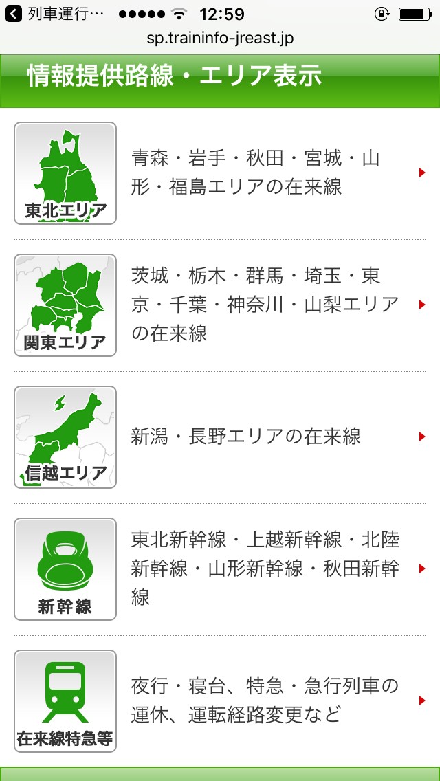 運行情報のページでは、JR東日本が管轄する、東北(青森・岩手・秋田・宮城・山形・福島)、