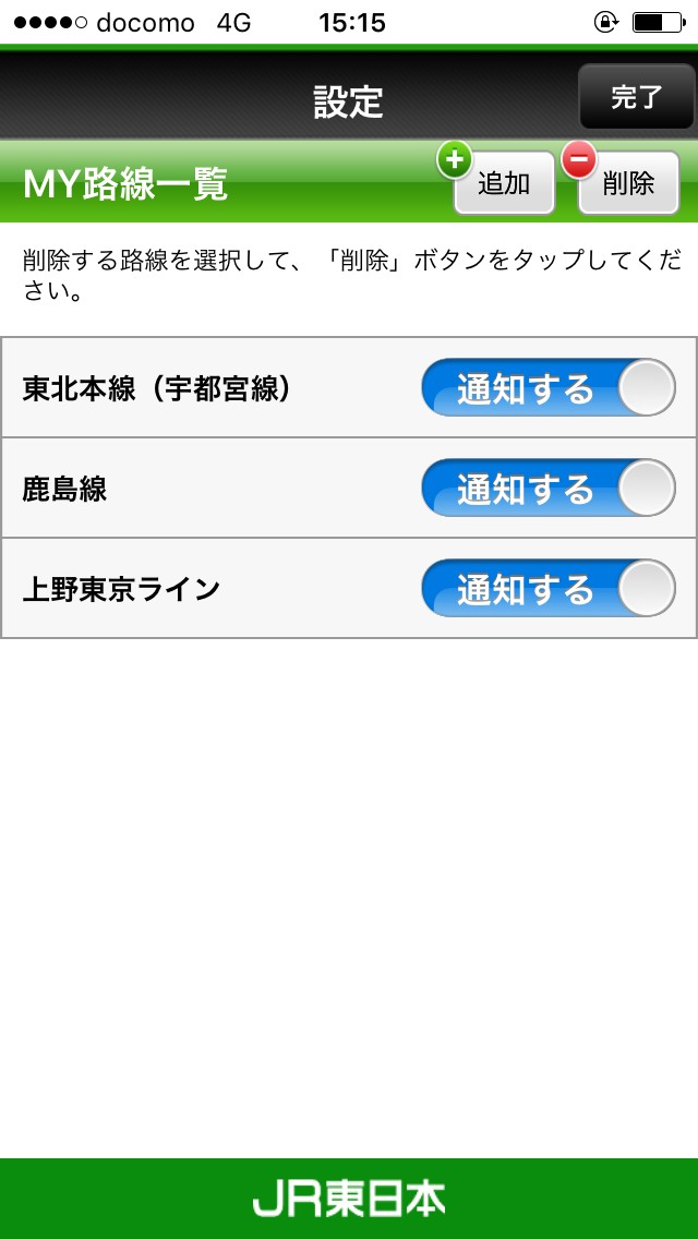 あらかじめMY路線に登録した電車に、運行情報が発生した場合、その時にこちらの「JR東日本 列車運行情報 プッシュ通知アプリ」を立ち上げていなくても、ご使用の端末に情報が届くというサービスがプッシュ通知になります。