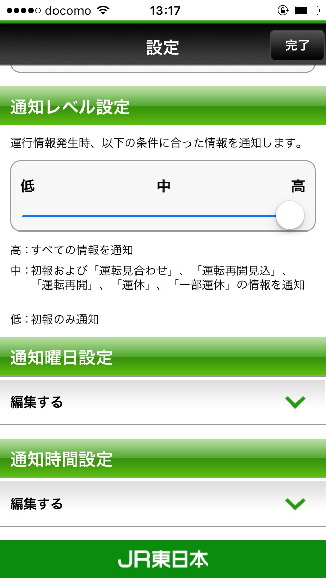 情報を受け取る頻度は、高:全部の情報/中:初めての報告(運転見合わせ、運転再開見込、運転再開、運休、一部運休)/低:初めての報告のみと3段階から選ぶことが出来ます。