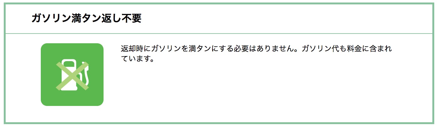 一般的にレンタカーなどを借りる際は、ガソリンを満タンにして返すのが当たり前ですが、「careco」の場合利用料金にガソリン代が含まれているため、ガソリンを入れて返す必要がありません。