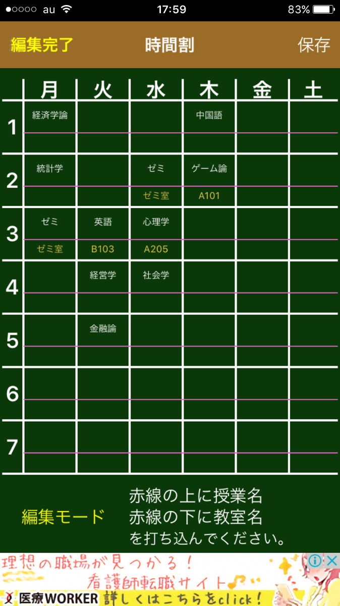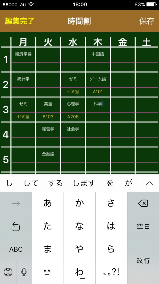 設定画面へのアクセスの必要がなく、授業を入れたいコマをタップするだけで簡単に情報を入力することができます。上の段には授業名、下の段には教室名や教授名を入力するなど、自分の見やすい方法でカスタマイズをすることが可能です。