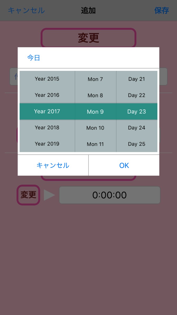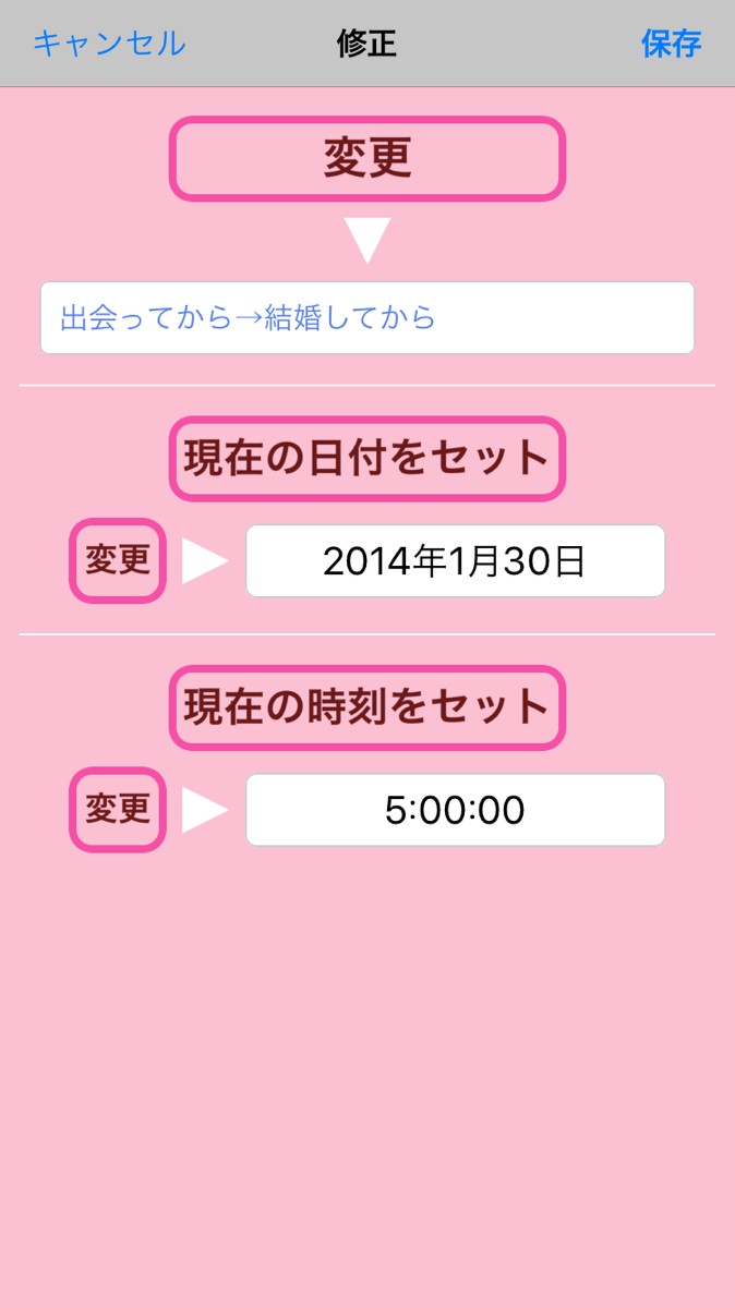 追加ボタンを押すと記念日の設定画面に移行します。一番上に記念日の名前(例:付き合った日)を入力した後、日付と時刻の設置を行います。「変更」を押すことであらかじめ用意されている日時が表示されるので、該当するものをタップするだけで設定完了です。わざわざ入力をしなくても良いところが嬉しいポイントです。