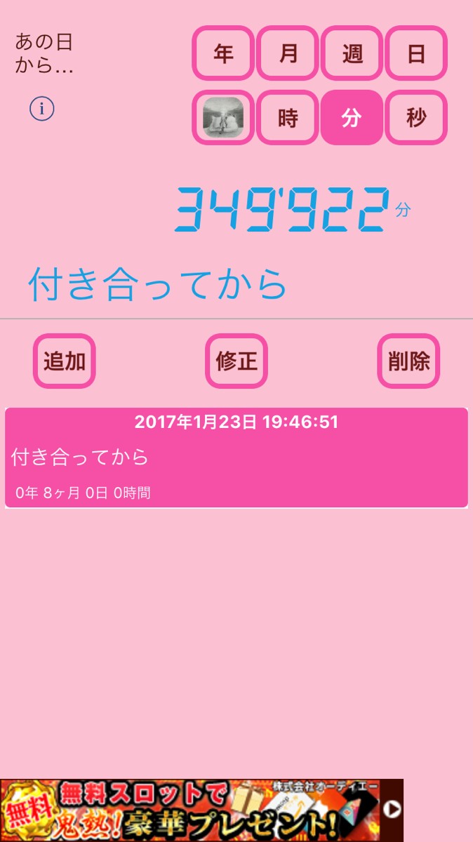 「あの日から…あの日まで」は、大切な記念日から、いったいどれだけの時を刻んでいるのかを知ることができるアプリです。ただ単に年数や月数を確認するだけでなく、「週」「日」「時」「分」「秒」といった細かい時間までを表示してくれます。