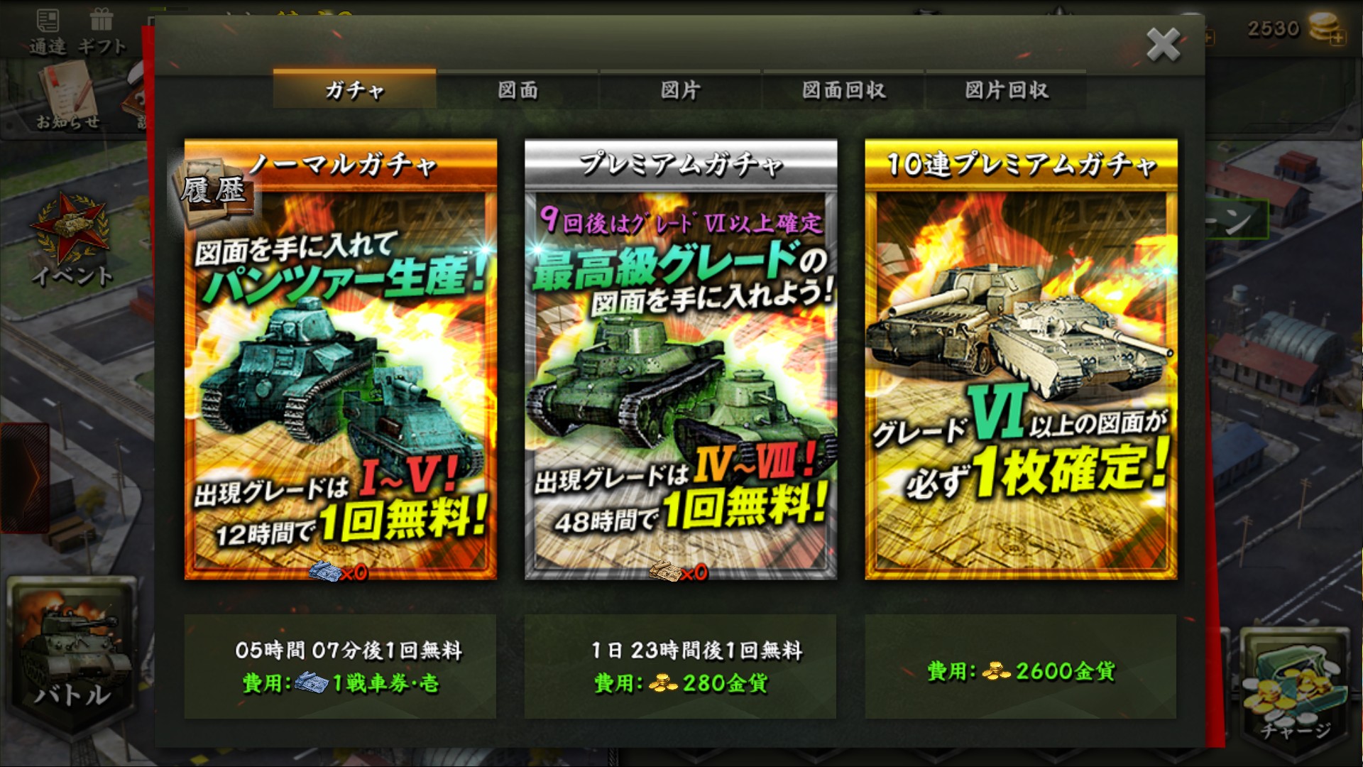 こちらでは実際にパンツァーや装備できる部品を手に入るガチャを引けます。
