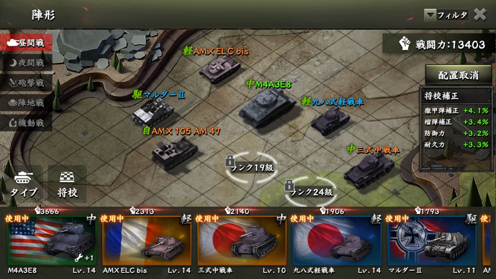 プレイヤーのLVを上げていくことで「夜間戦」「砲撃戦」「陣地戦」「機動戦」を選んで設定することができるようになります。