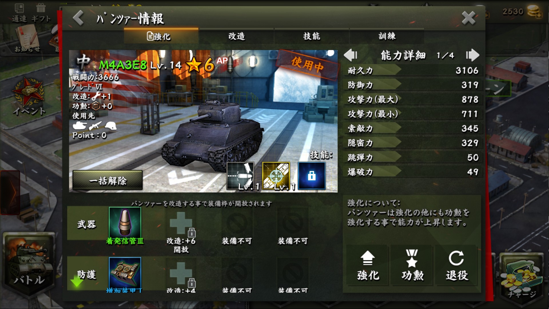 パンツァー毎に技能という戦闘を有利に進めれる技があるんですがそちらも詳細で確認できます。