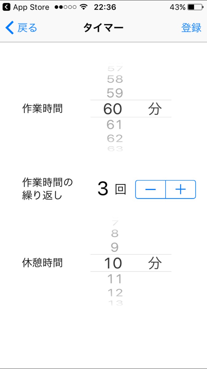 画面真ん中の時計マークをタップすると、時間の設定画面に移行します。上から順に「作業時間」「作業の繰り返し回数」「休憩時間」となっています。時間と回数を選択したら、登録ボタンを押して完了です。