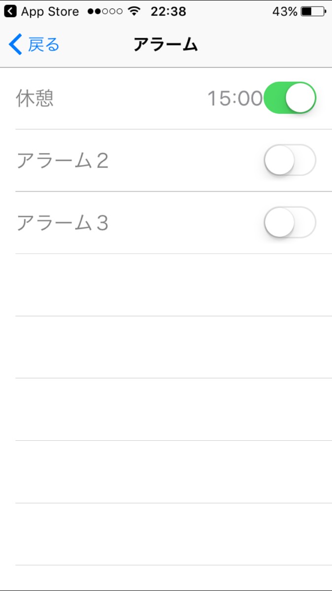 画面左下の目覚まし時計マークをタップします。アラームは3つまで設定が可能です。設定するアラームをタップすると設定画面を開くことができます。アラームの名前を変更したい場合(例えば、「休憩」等)、「アラーム」という表示がある場所を選択することで、自由に変更することが可能です。