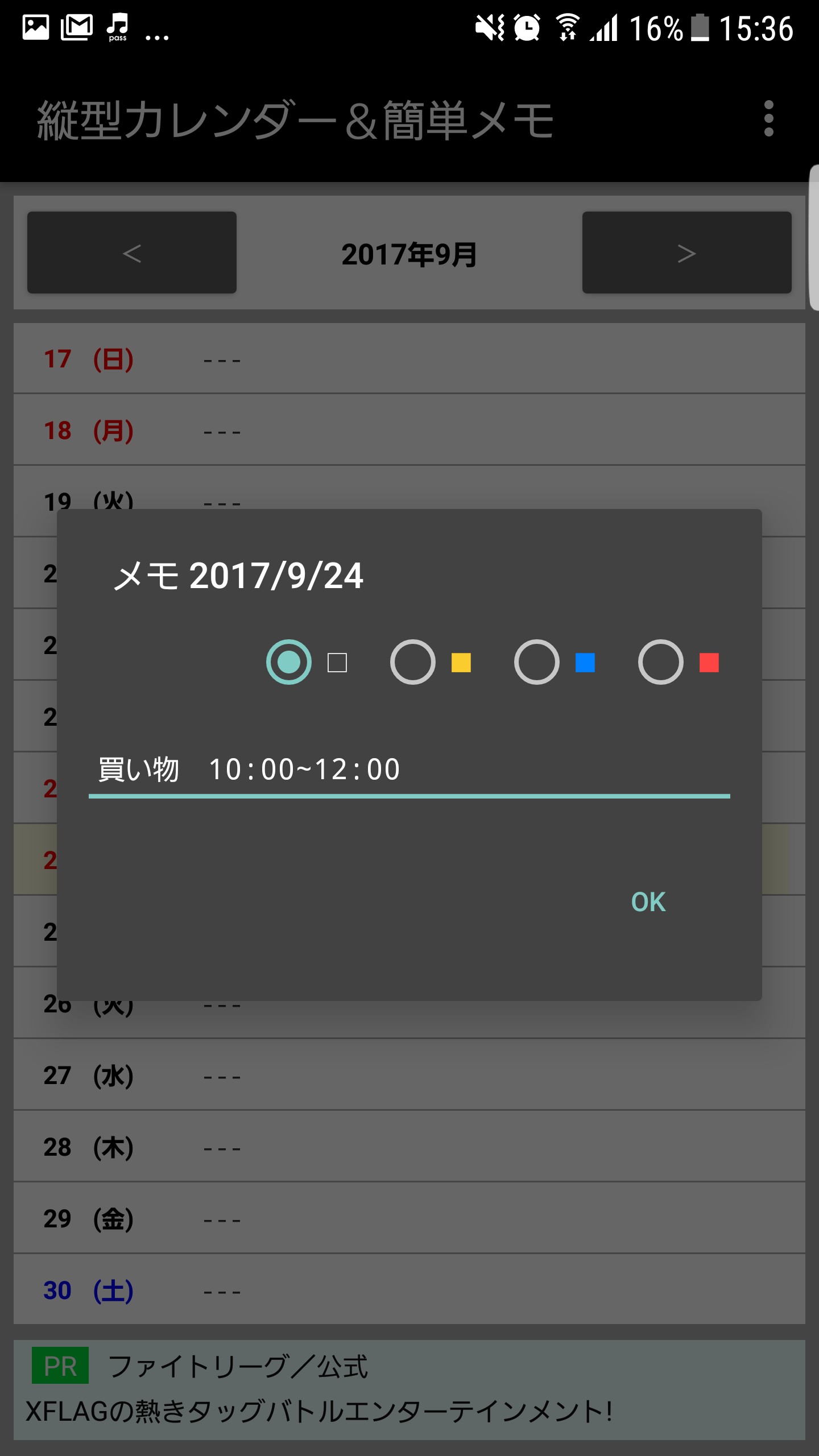選択した日付にメモや予定を入力することができます。本アプリの特徴は自分の利用しない不要なコマンド(ボタン)を、非表示にするなど機能面の若干なカスタマイズが可能です。また、無料アプリによくある広告が一切ありませんので広告表示が気になる方にもおススメです。