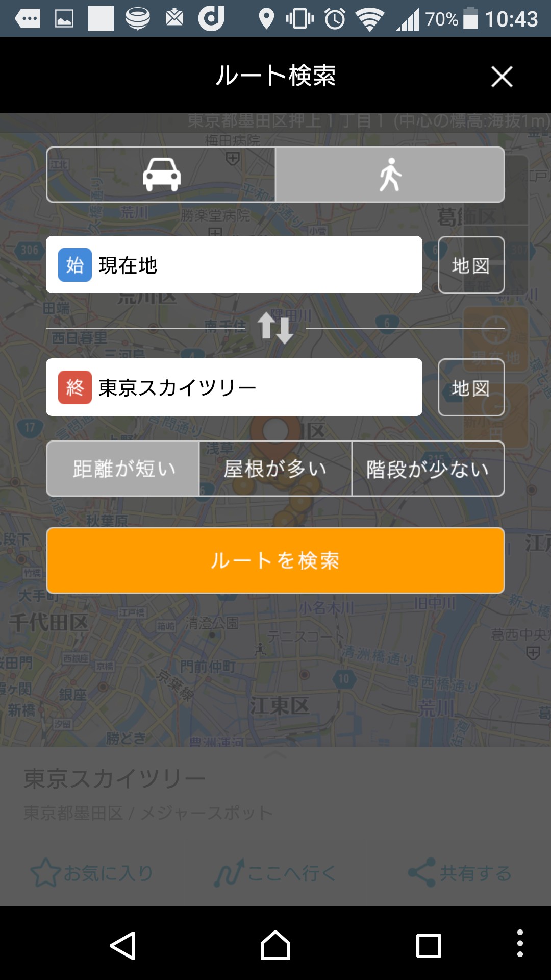 徒歩のルート検索では、距離が短い・屋根が多い・階段が少ないの3つの項目を使って自分が歩きやすいルートを探すことが出来ます。