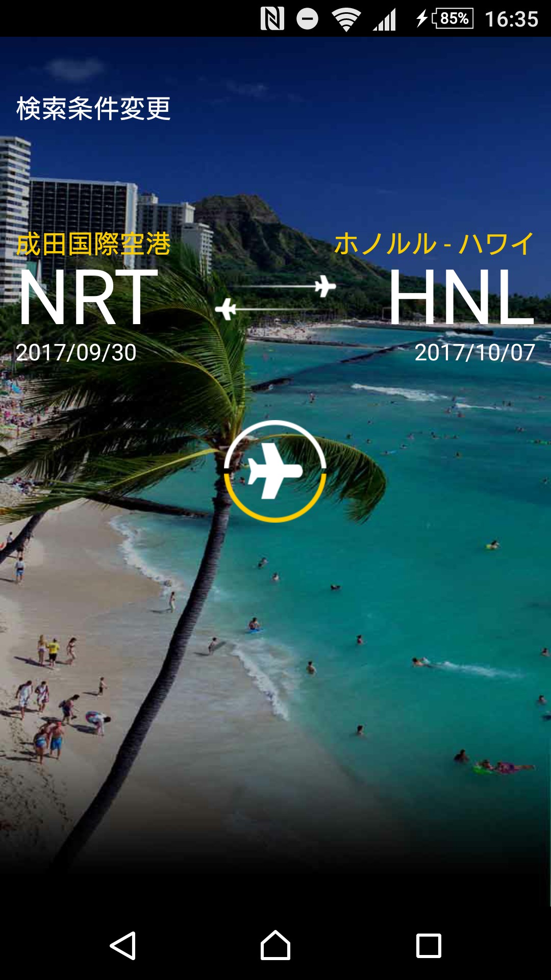 航空券検索を選ぶと出発地や到着地などを選択する画面に切り替わります。ここで出発空港と到着空港、日程や人数などを選択し、検索をタップすると検索が開始され、最適な航空券が表示されます。