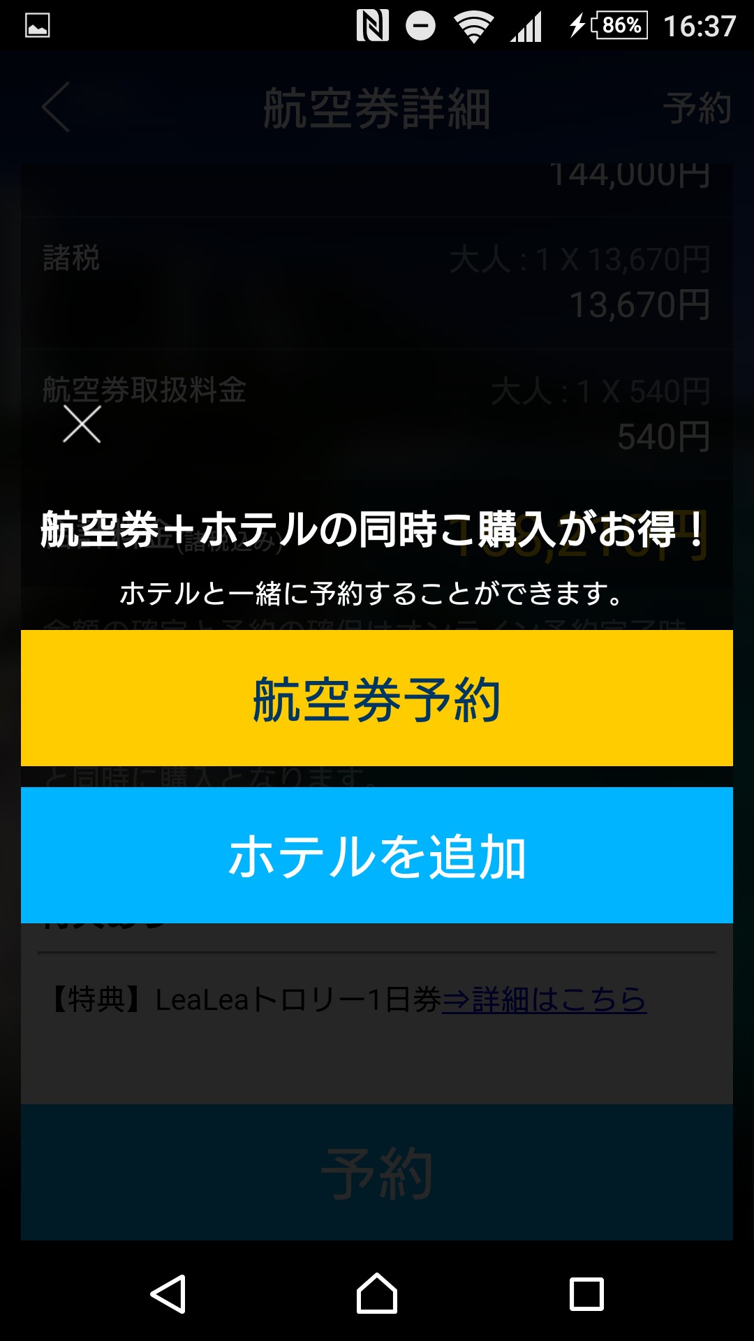 予約をタップすると航空券を予約するメニューとホテルを追加するメニューが表示されます。ホテルも同時に予約する場合はここで【ホテルを追加】を選び、ホテルの検索画面へ進みます。宿泊予定の地域と宿泊日数、宿泊人数を選び検索をタップするとホテルが表示されます。ホテルを選ぶと航空券とホテルを合わせた料金が表示され、指示に従って進めば航空券とホテルの予約が完了です。とても簡単なので、旅行に行きたい!と思ったら直ぐにお得なプランで予約ができますよ。