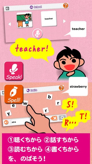 ④の書く力では、実際に書くのではなく、アルファベットのパネルから文字を選んで、並べ替えるというやり方です。並べる前にイラストとともに一旦、正解のスペルが表示されますが、消えてしまいます。そこで、そのスペルを再現するという方法になります。見せてしまってからでもあんがい、再現するとなるとしっかり覚えていないとなかなか書けないので、こうした手法を採用しております。②はなす力では、実際にあなたが声を出して表示された単語を読んでください。→採点されるので、しっかりと発音できるまで何回も練習して下さい。以上のように英語の学習の柱をしっかり踏まえて学ぶことを可能にしたのが「パパドリル+プラス えいたんご・ブロンズ上巻」です。