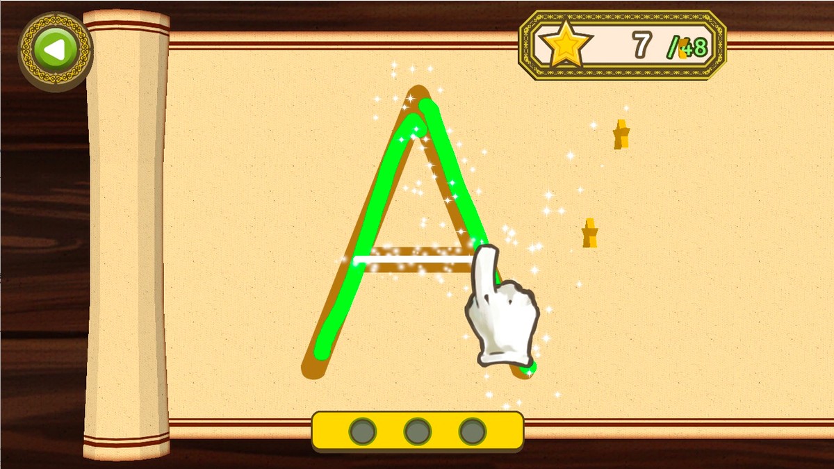 マップからアルファベットを選択して「PLAY」ボタンを押したら、最初はアルファベットを指でなぞって書いていきます。書く順番は魔法の手が教えてくれるので、それに習って指でなぞってみてくださいね。上手くなぞることができれば、たくさんの星をゲットすることができます。