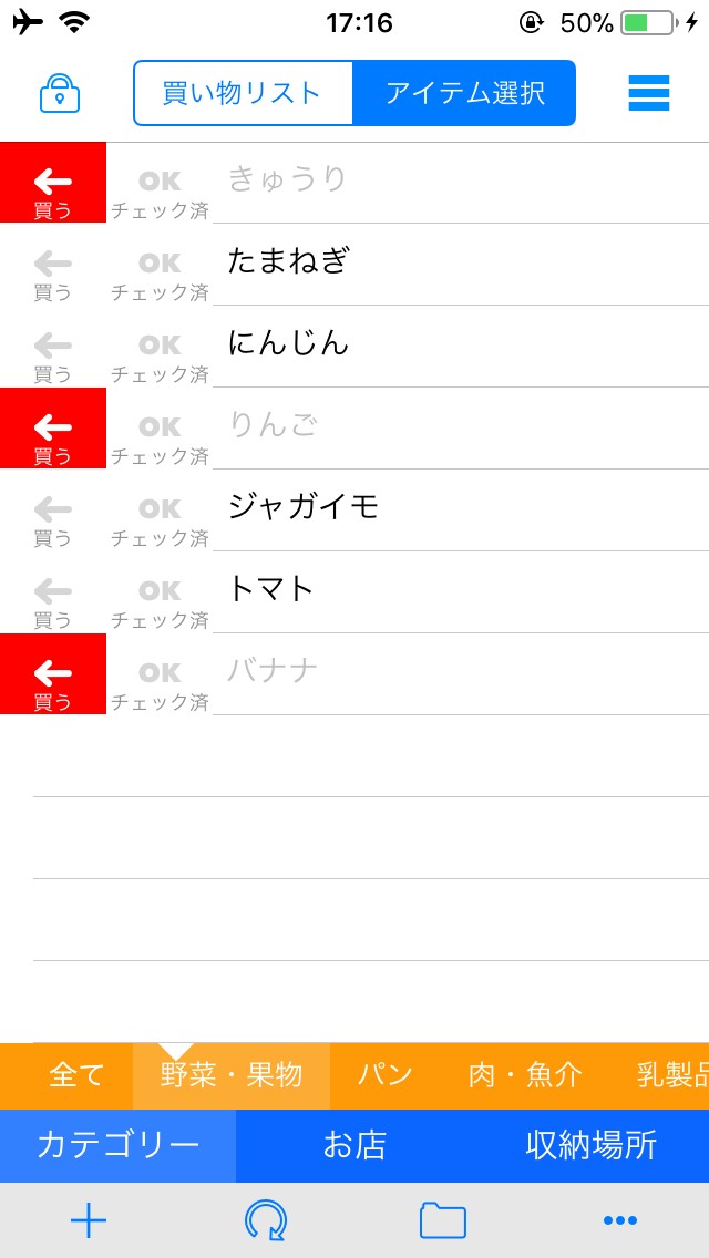 基本的な食材や生活必需品などは、あらかじめアプリ内にアップされていますので、タップして選択するだけでサッとスピーディーに買い物リストを作成できます。