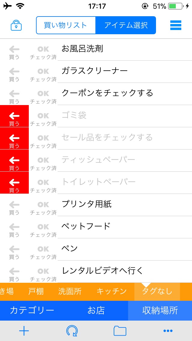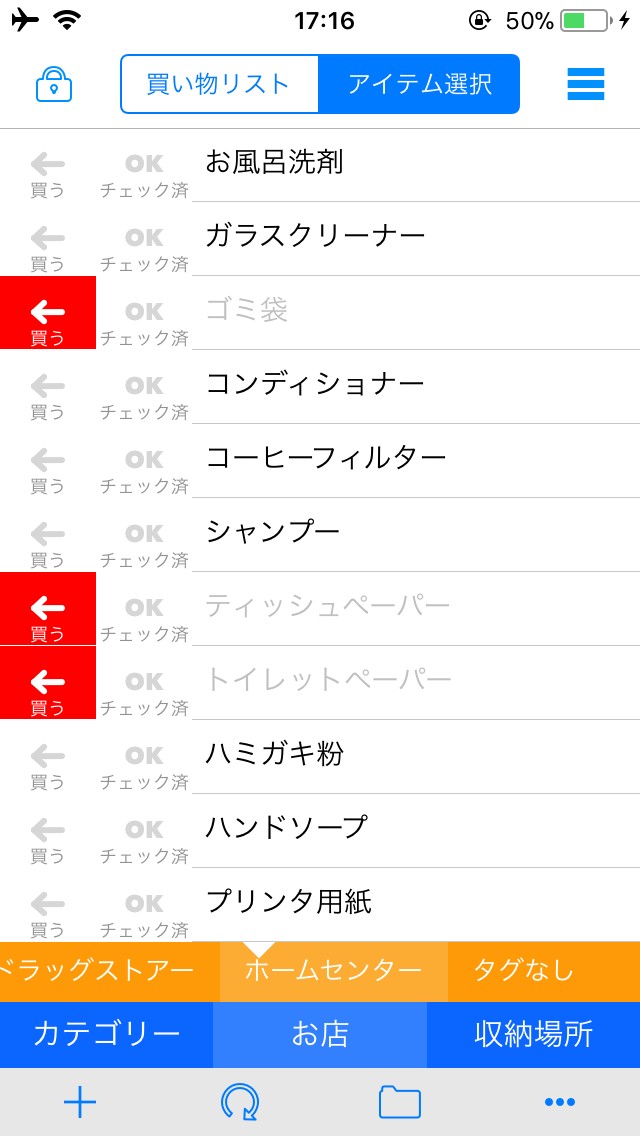 二つ目は、いつも行くスーパーやドラッグストア、ホームセンターなどに分けてリスト作成ができる点です。