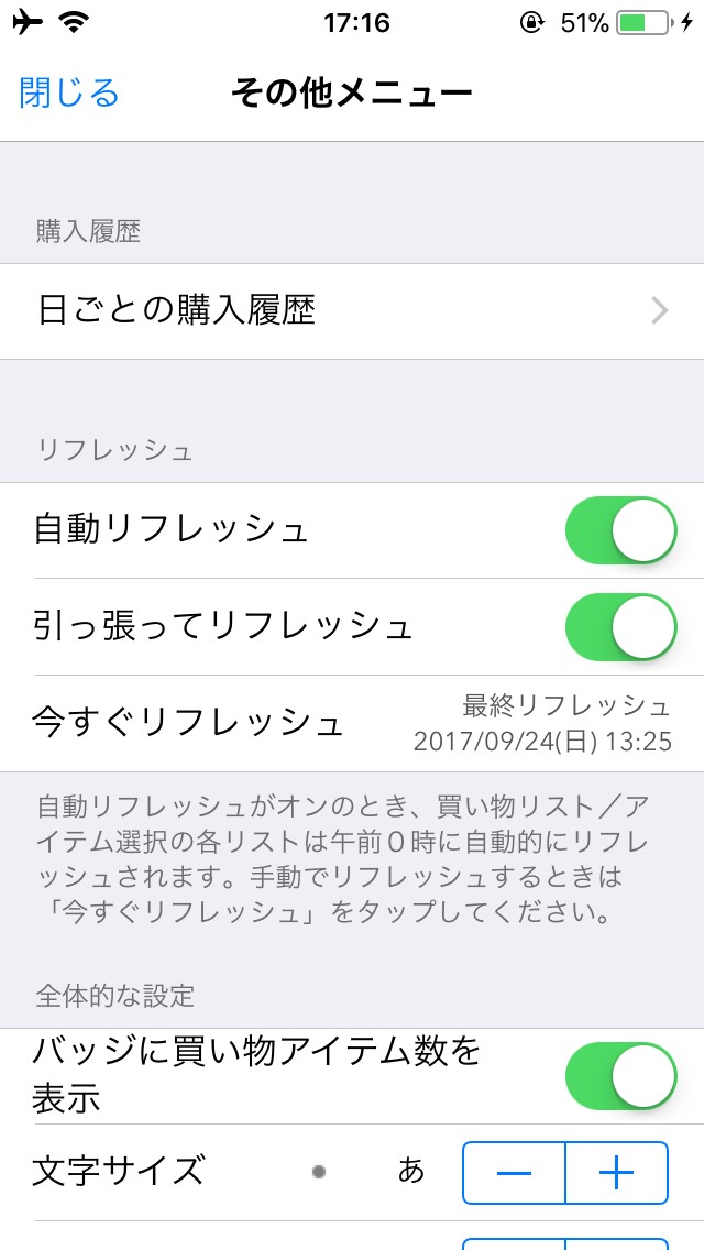 「いつもの買い物リスト」では、設定画面から日付ごとの買い物履歴を表示させることができます。