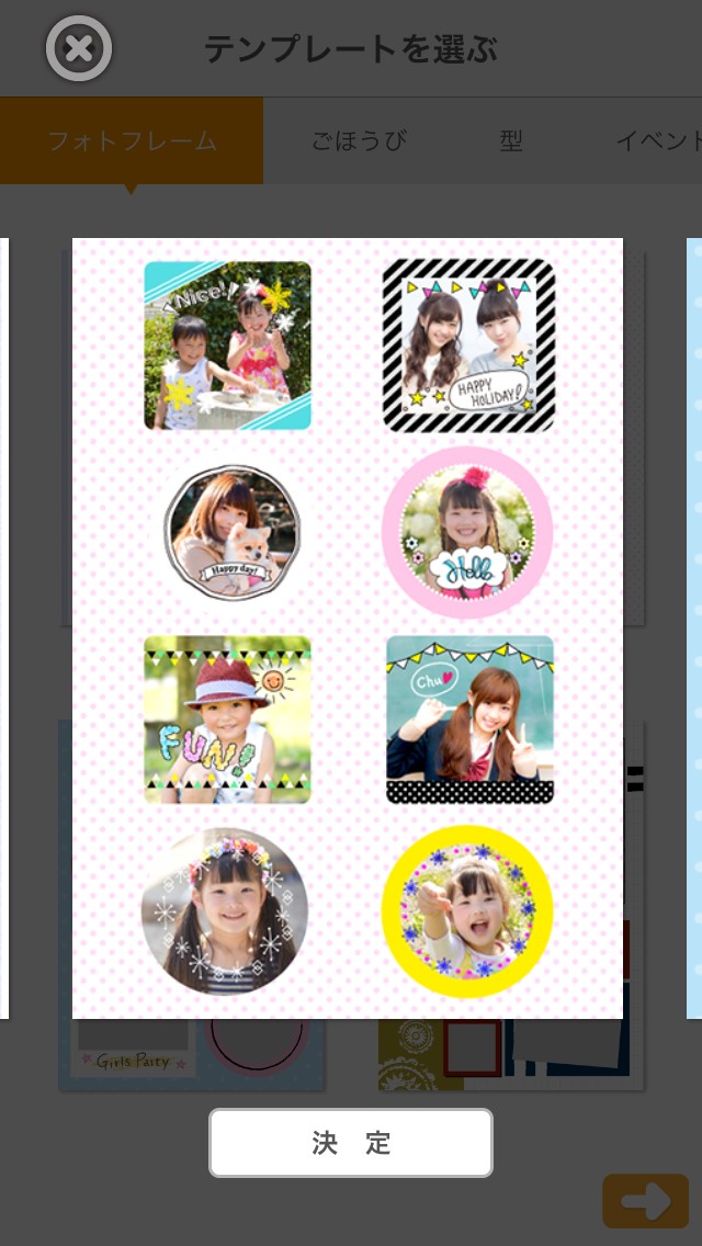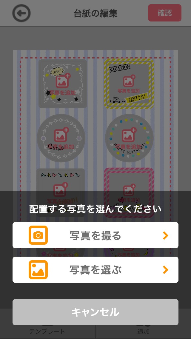 一つ目は、テンプレートに写真を当てはめていく作り方です。豊富な種類の中からお好みのテンプレートを選び、それぞれの枠に入れたい写真を選ぶだけでシールが完成します。といっても、テンプレートもしっかりデザインされた可愛らしいものなので完成度は高いです。