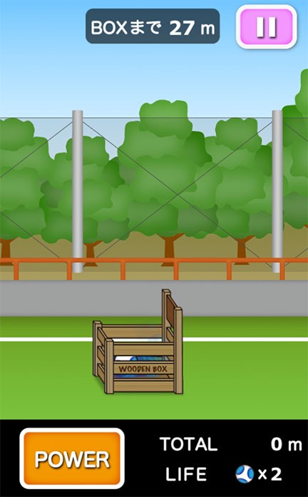 どういうわけかゴールといいながら球を入れるのは「木箱?椅子?」です。いい感じで飛んできて、ゴールに入るかと思いきや、椅子の背もたれみたいな部分にボールがあたって、跳ね返ってしまうこともあるのでやや注意がいるようです。ライフは3個までですので、3回ゴールを決められなければ、ゲームオーバー、というあっけない幕切れです。成功してうまく箱にボールを入れられれば、その箱までの飛距離が加算されてTOTALの数字に表示されます。ライフは3つです。タンタンとキックし続ける姿はなんともかわいらしい。しかしこのゲームならばあまり夢中にならないで済むから、たしかに待ち合わせとか、10分くらいあいている時間を潰したいなどに適当かと思います。