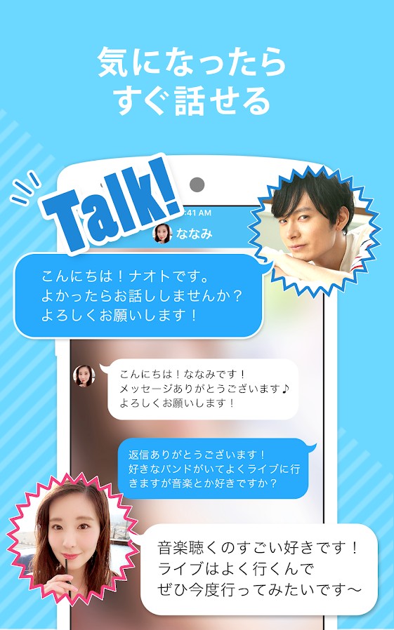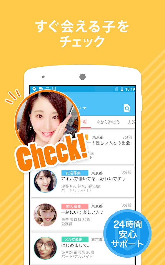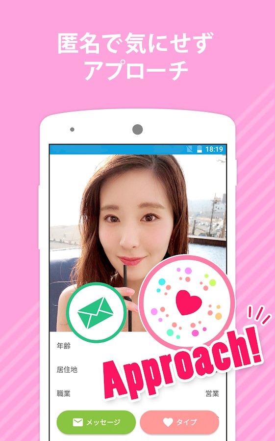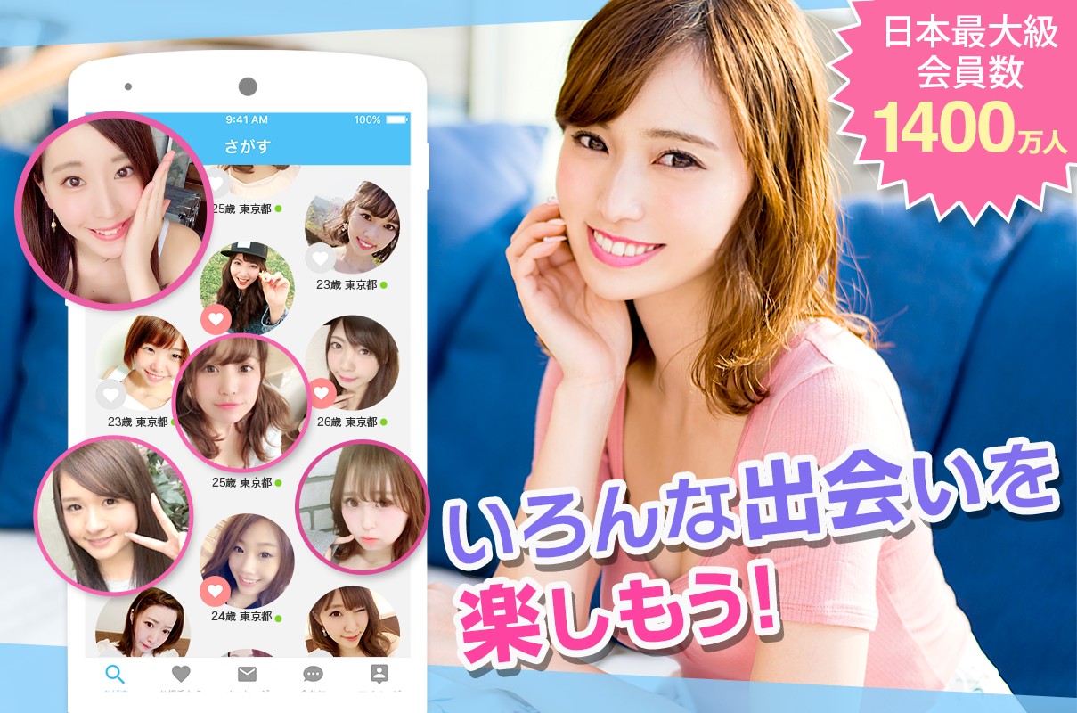 メール等の機能を使うには、公的な身分証を用いての年齢確認も行われています。20代~30代の利用者が多く、友達探しやフランクな付き合いの恋人探し、真剣な恋活・婚活まで、幅広い利用者層が特徴です。