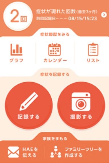 HAEの発作が現れたら、アプリを起動して記録します。記録の方法は、スマートフォンのカメラで症状が出た場所を撮影するだけです。症状を記録することで、発作についてさらに詳しく知ることができるようになります。