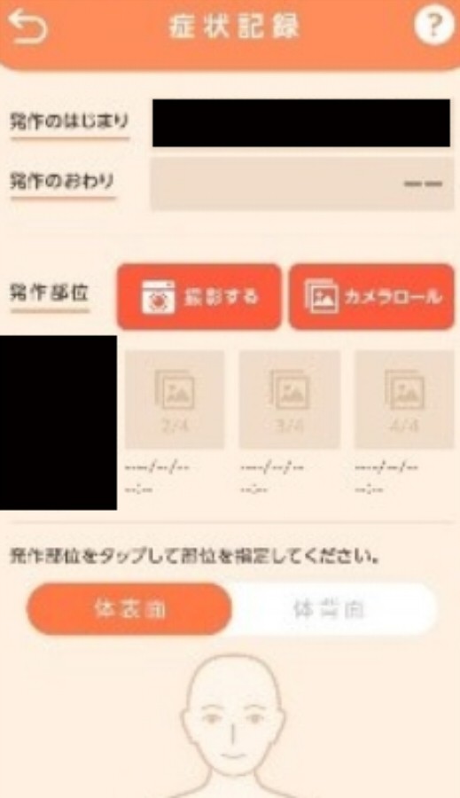 HAEの症状を記録する際に、カメラで撮影するだけではなくさらに詳細に残すことも可能です。その場合には、症状が出た部位がどこかを選択します。また、発作の強さがどれくらいか、治療はしたか…というさまざまな選択肢を選んでデータを記録しましょう。