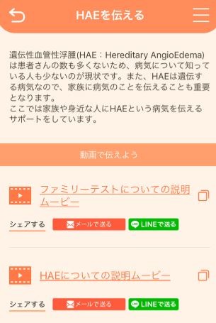 HAEアプリでは、「HAEを伝える」というメニューで簡単にHAEについて伝えることが可能です。ファミリーツリーの作成時にも、親族にムービーを使って伝えることができるので、おすすめの機能です。身近な人に、HAEとはなんなのかをメールやLINEで伝えましょう。