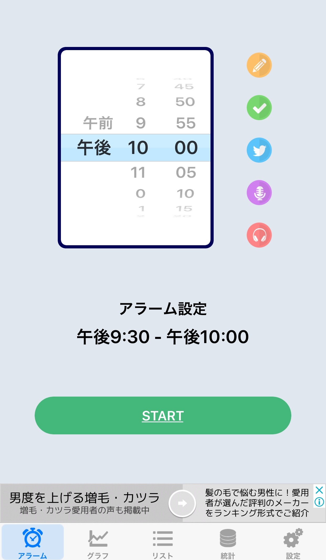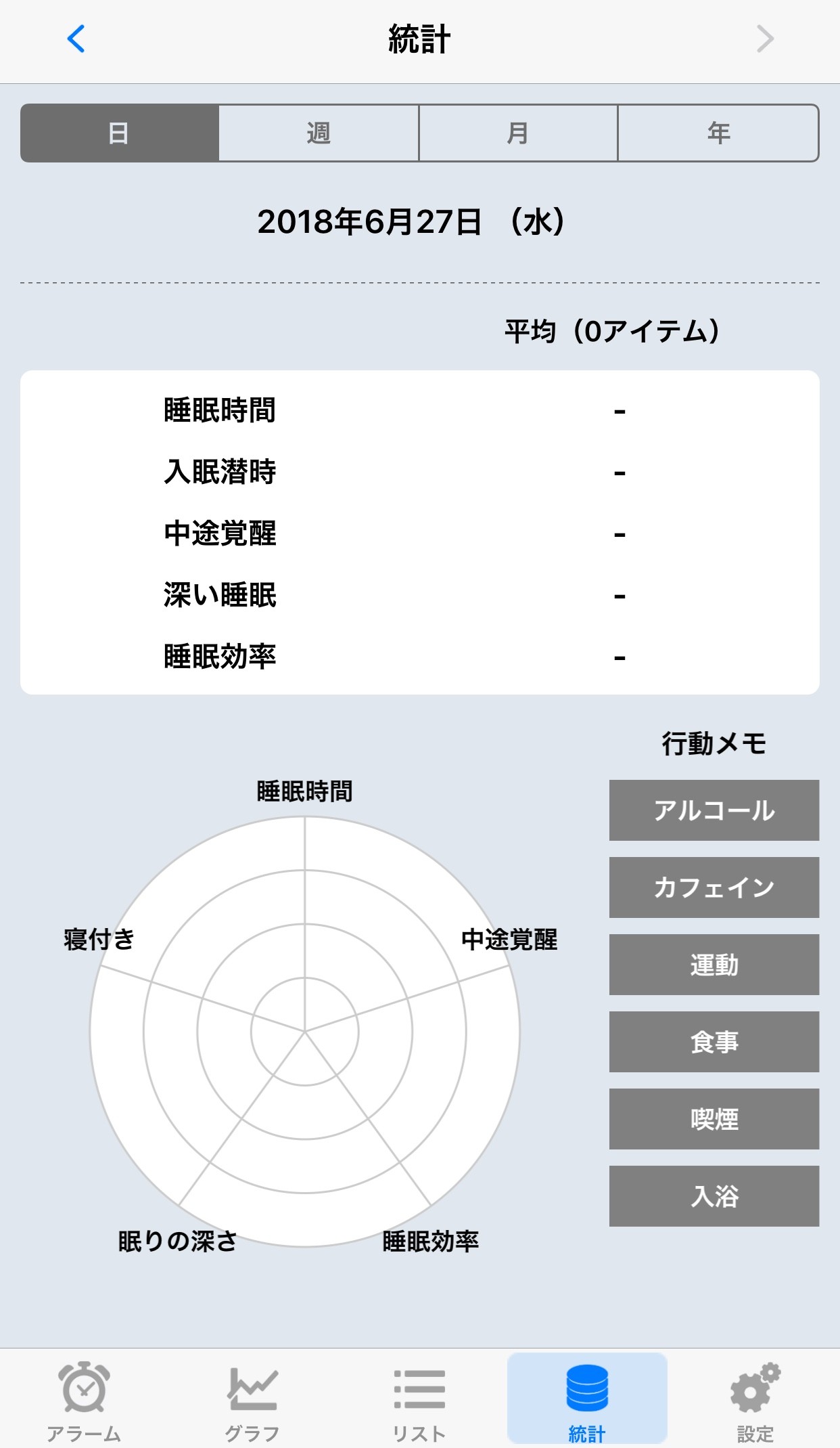 アラーム設定は下のアラームバーをタップして時計をセットするだけです。リストやグラフでは自分の睡眠の変化をチェックすることが可能です。統計では睡眠時間や眠りの深さをチェックすることができ、行動メモというアルコールや喫煙、入浴にチェックを入れる機能もついています。