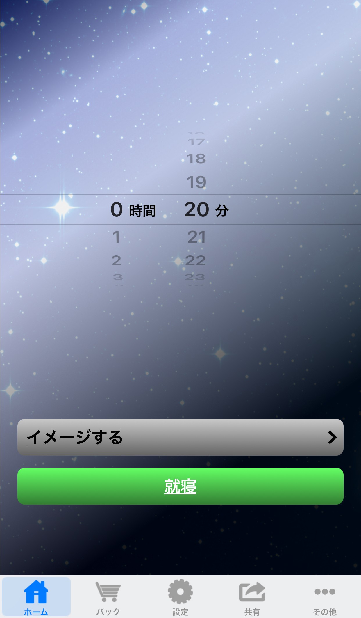 時間をセットし、次にイメージしたいことを選び「就寝する」ボタンを押します。このアプリは、色々な事柄をランダムにイメージさせることで、寝る前につい考えてしまうものを中断してくれるアプリです。パックは有料です。そのため、寝る前に嫌なことを考えてしまった、不安を感じて寝付けなくなってしまった、イライラすることを思い出した、そんな時に効果が期待できるアプリです。