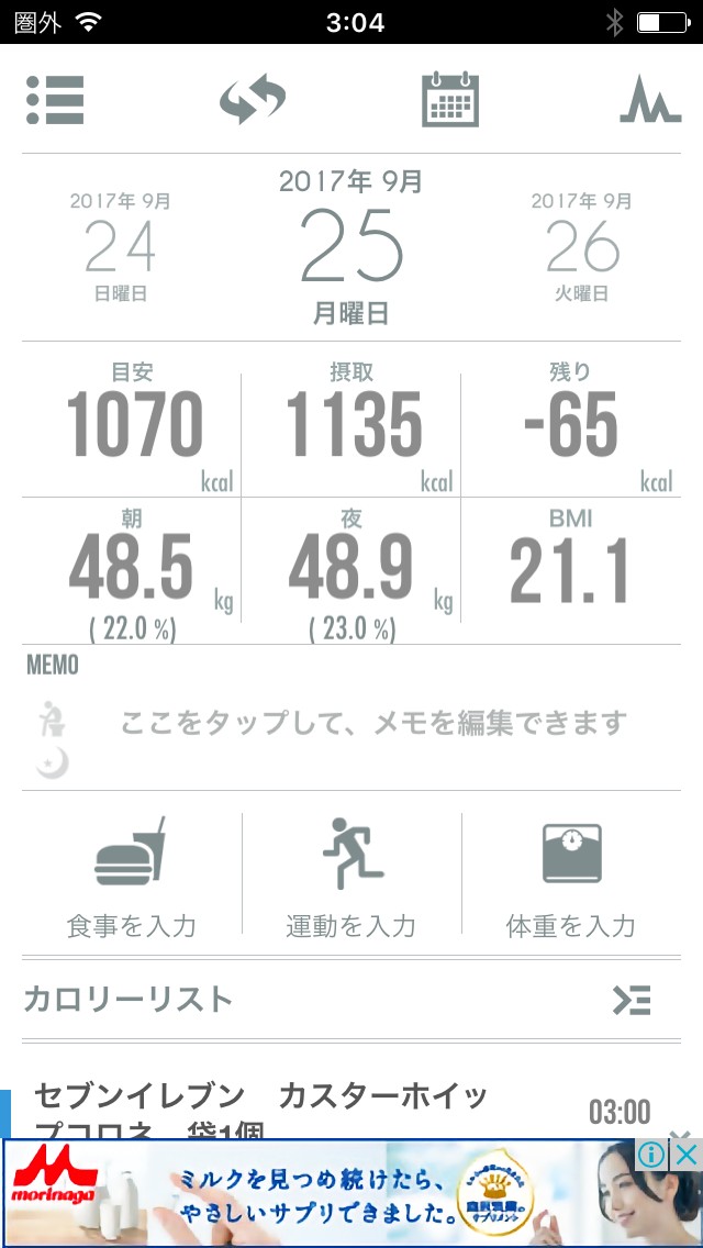 食事・運動・体重・BMIなど、情報はすべて一日単位一画面で表示されます。