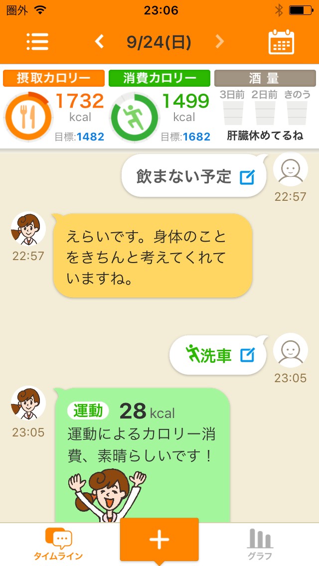 タイムライン上で管理栄養士のカロリーママから運動、食事のアドバイスがもらえます。