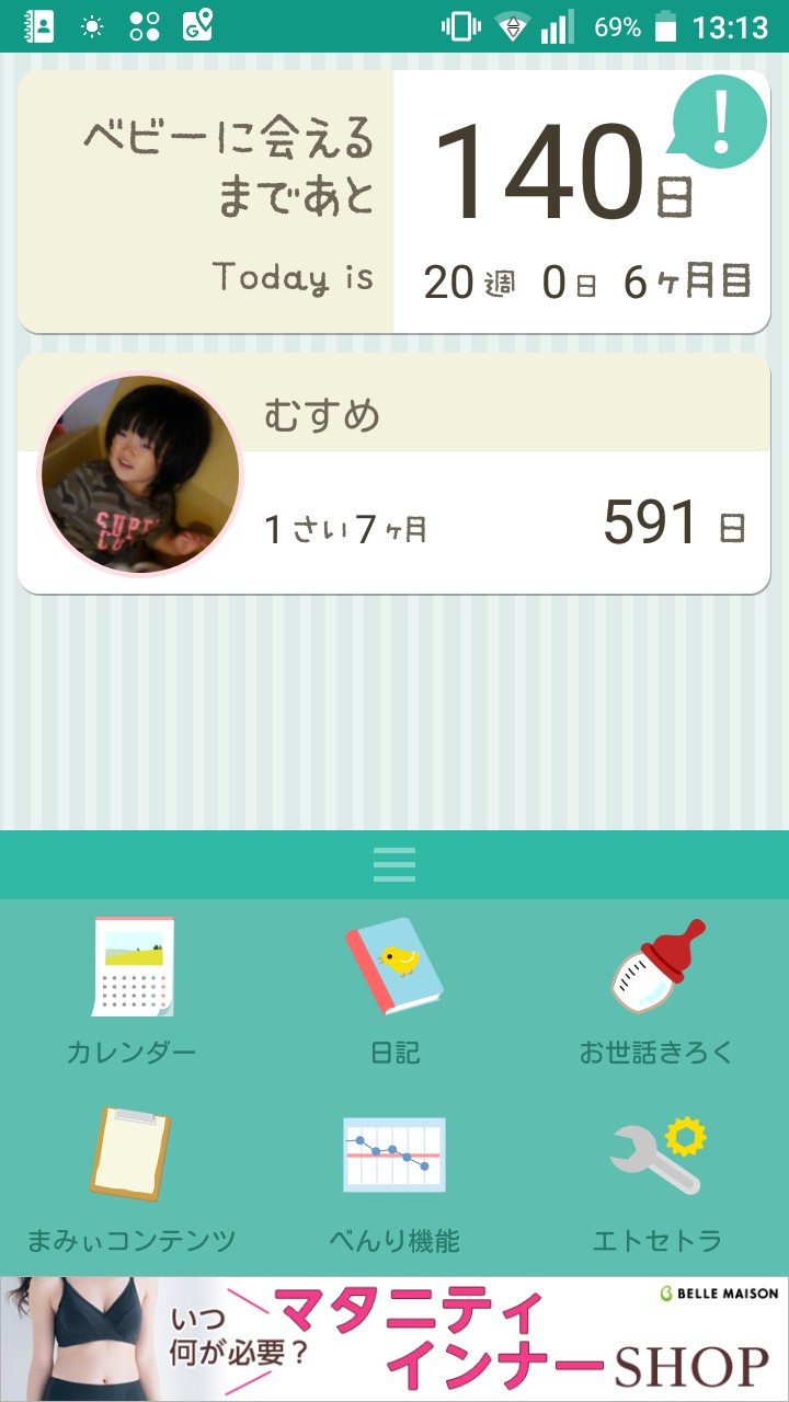 マタニティ期には出産予定日カウントダウンを、出産後にはお子様の生後日数をカウントしてくれます。
