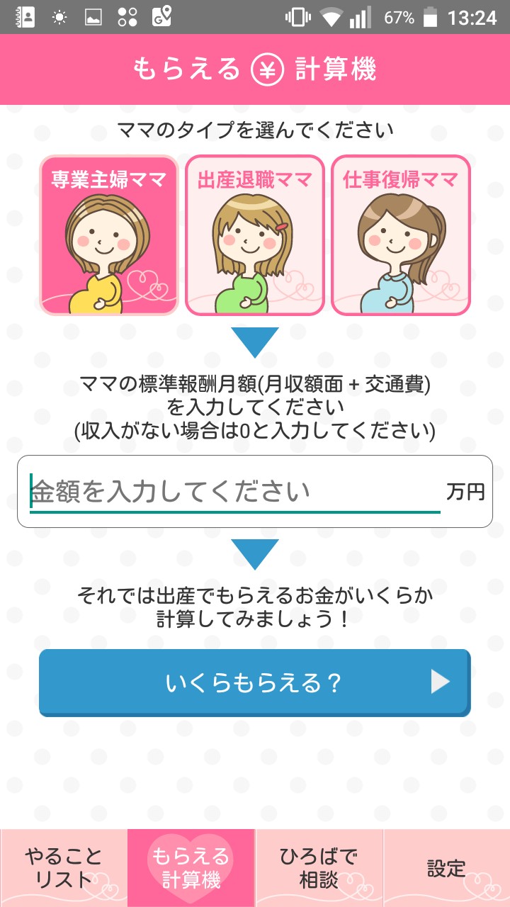 「もらえる計算機」で、ママのタイプ別に収入を入力するだけでもらえる目安金額をシミュレーションしてくれます。