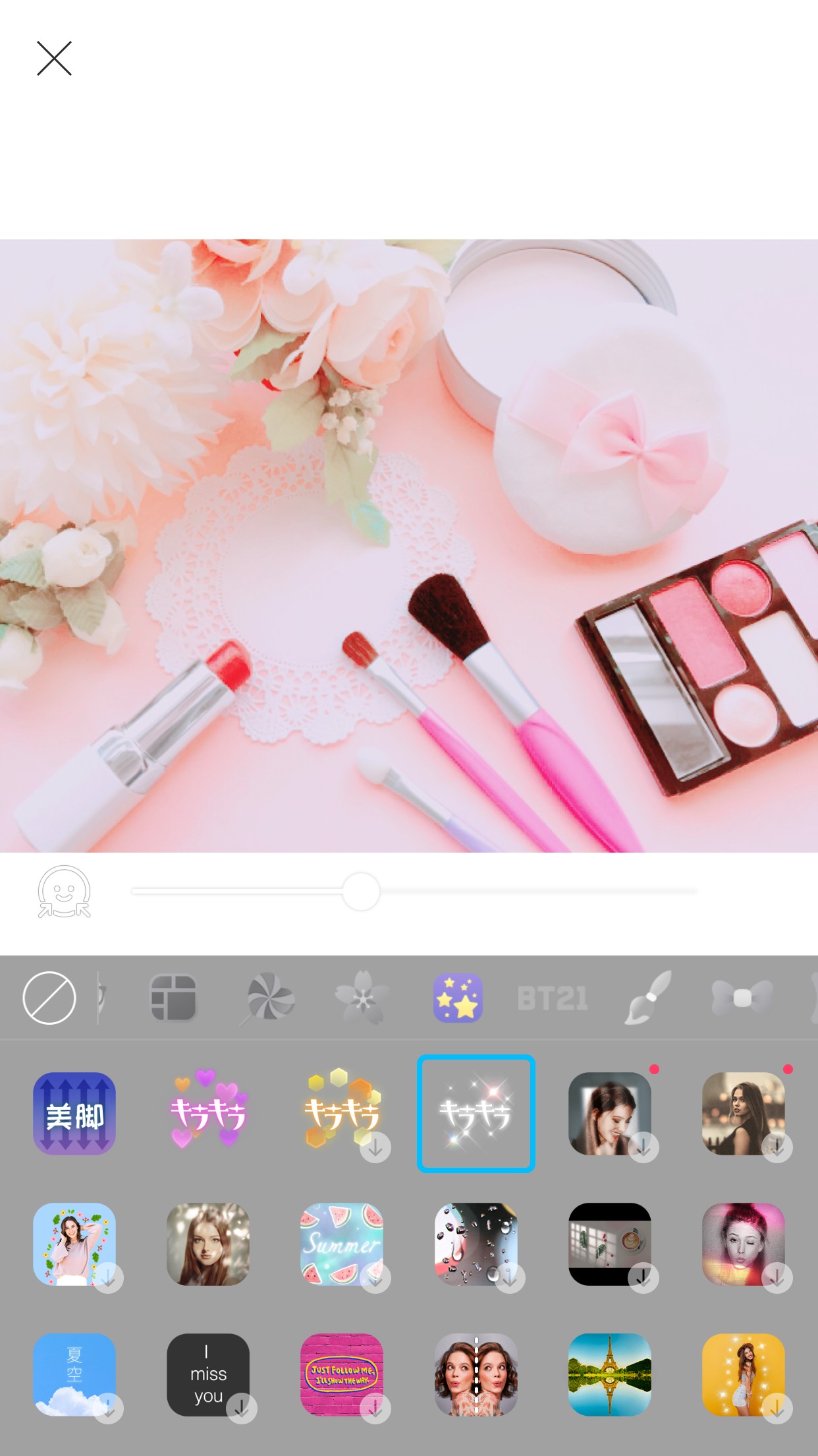 その名の通りフィルターを使用してキラキラさせる加工です。アプリにもよりますが、フィルターも星や宇宙といった空にまつわるものから、ハートや花といった可愛いものまで多くの種類が用意されているものもあります。その写真に写っているものにあったフィルターを選ぶだけで一気におしゃれな写真になります。このキラキラ加工の良いところは、ほとんどのアプリでボタン一つで加工ができることです。難しい作業なしで派手で可愛い写真が完成します。